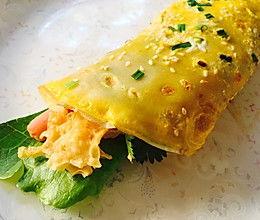 2. 生菜火腿肠:将生菜洗净切丝,火腿肠切片,放在煎饼果子上。